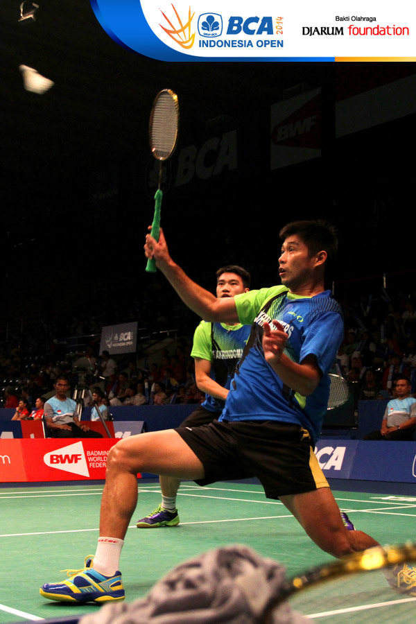 Rendra Wijaya/Rian Sukmawan (Indonesia) berhasil menghadang pengembalian dari Jacco Arends/Jelle Maas (Belanda)