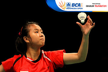 Li Lian Yang (Malaysia) bersiap mengembalikan shuttlecock ke arah Dinar Dyah Ayustine (Indonesia)
