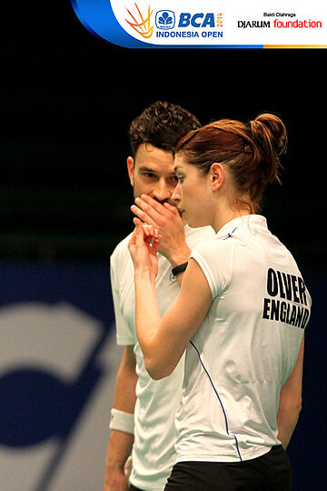 Chris Langridge/Heather Olver (Inggris) saling berkoordinasi saat melawan M. Rijal/Vita Marissa (Indonesia)