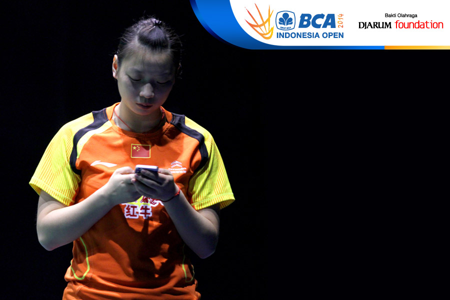 Yaqiong Huang (China) terlihat asyik dengan gadgetnya sebelum melakukan pemanasan