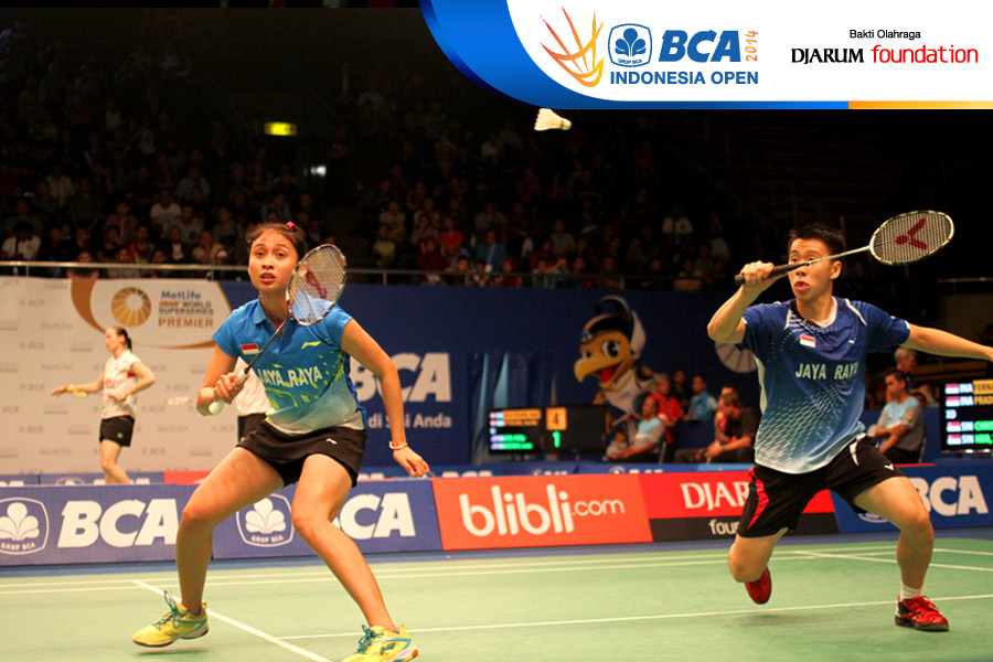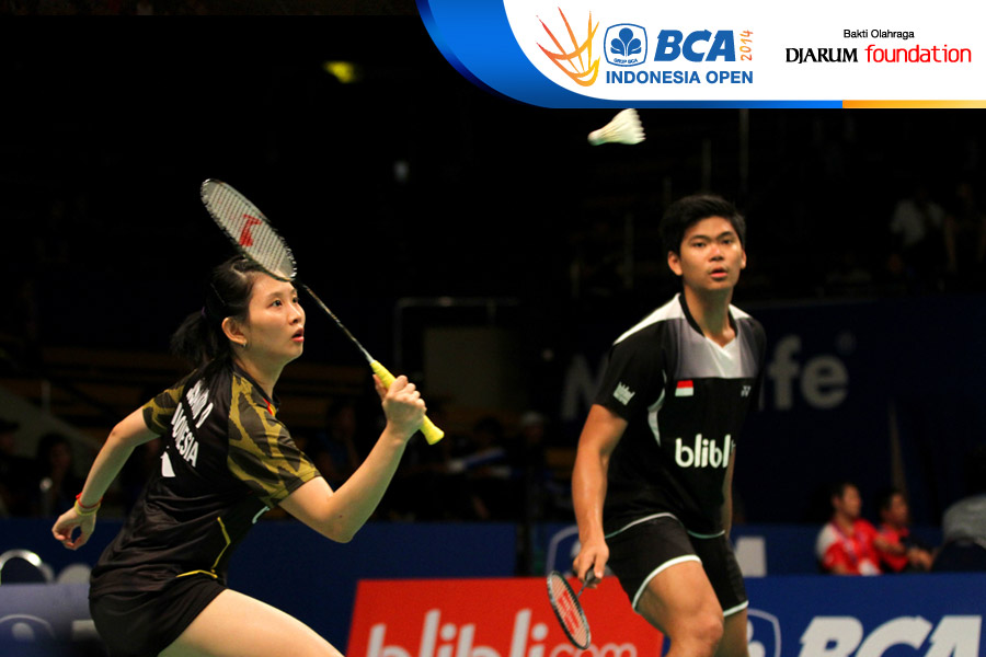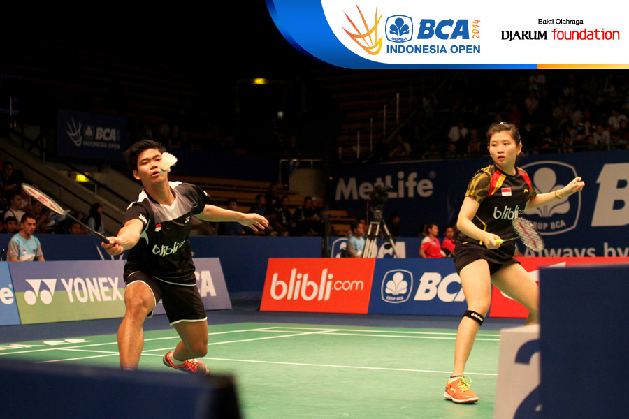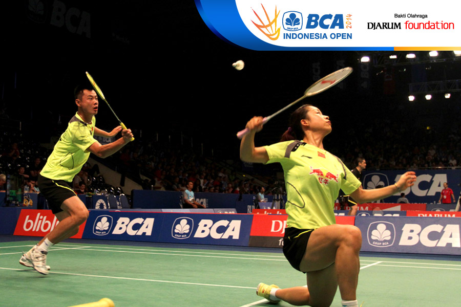 Markis Kido/Pia Zebadiah (Indonesia) mengembalikan shuttlecock ke arah Kai Lu/Yaqiong Huang (China)