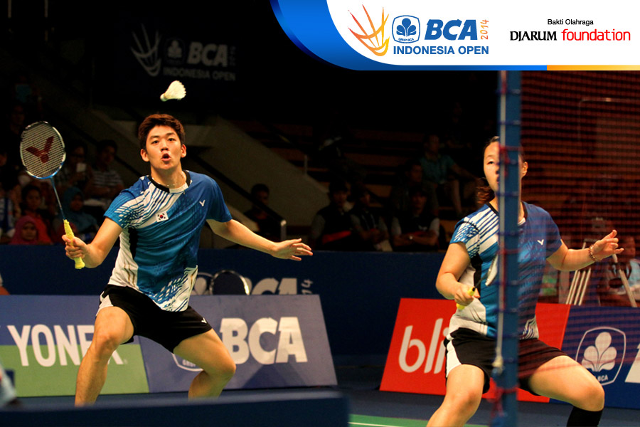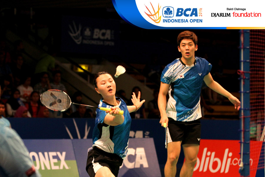 Kim Ki Jung/So Young Kim (Korea Selatan) bersiap menyambut pengembalian dari Xu Chen/Ma Jin (China)