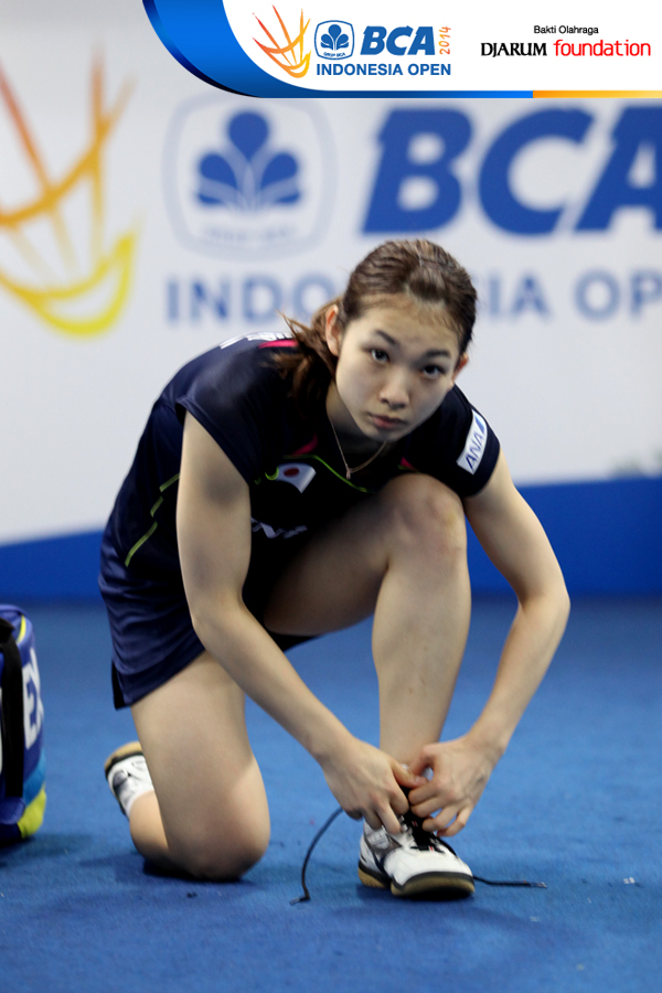 Misaki Matsutomo (Jepang) sedang mengencangkan ikat tali sepatu