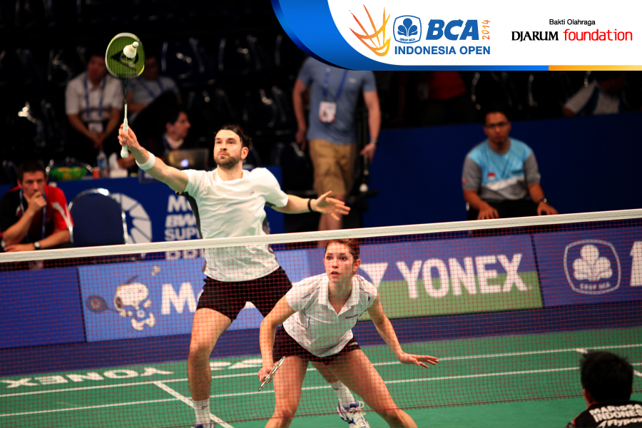Muhammad Rijal/Vita Marissa (Indonesia) Berusaha mengembalikan shutllecock ke arah Chris Langridge/Heather Olver (Inggris)