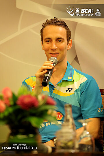Mathias Boe, salah satu pebulutangkis andalan Denmark menjawab pertanyaan media saat acara press conference.