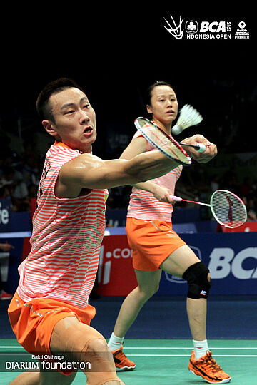 Zhang Nan/Zhao Yunlei (China) bersiap menyambut pengembalian dari Yoo Yeon Seong/Chang Ye Na (Korea Selatan).