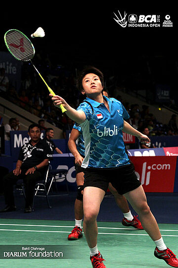 Lindaweni Fanetri (Indonesia) mengembalikan shuttlecock ke arah Gregoria Mariska (Indonesia).