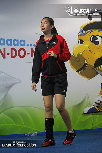 Adrianti Firdasari (Indonesia) melakukan pemanasan sebelum bertanding.