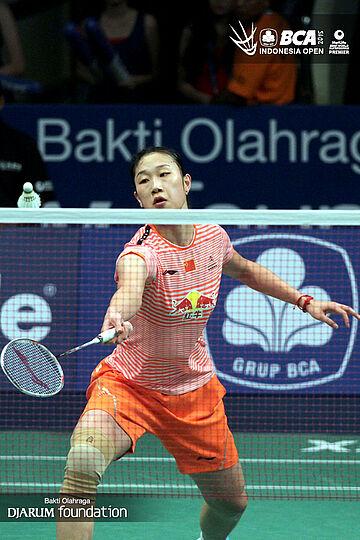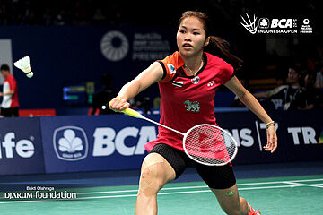 Sun Yu (China) mengembalikan shuttlecock ke arah Busanan Ongbumrungpan (Thailand).