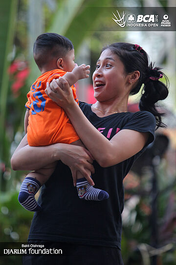 Rizki Amelia (Indonesia) terlihat akrab saat sedang menggendong seorang bayi.