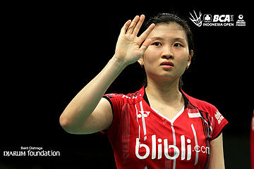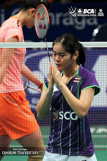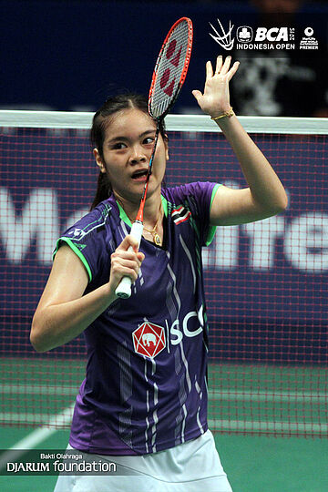 Busanan Ongbumrungpan (Thailand) memberikan apresiasi kepada seluruh pengunjung Istora Senayan yang telah mendukungnya.