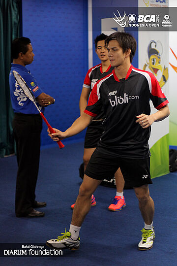 Andrei Adistia (Indonesia) melakukan pemanasan sebelum bertanding.
