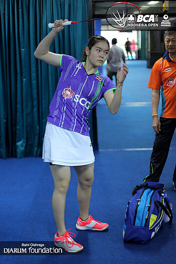 Busanan Ongbunmrungpan (Thailand) melakukan pemanasan sebelum bertanding.