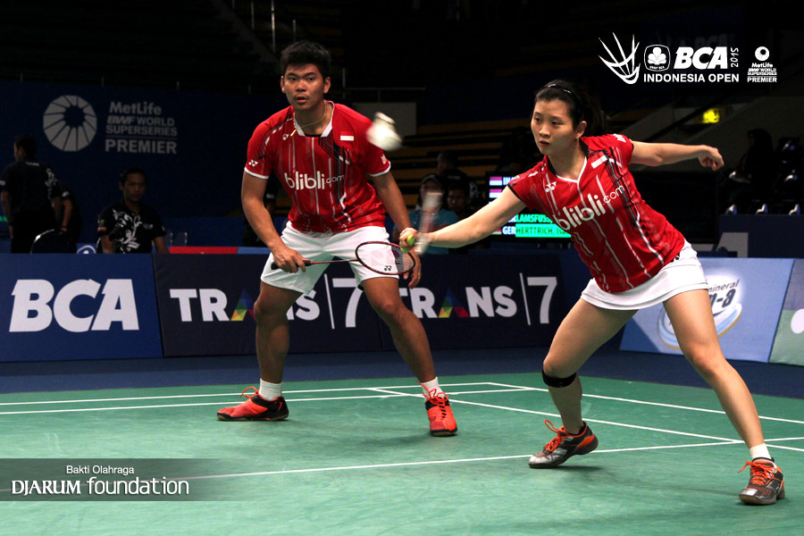 Praven Jordan/Debby Susanto (Indonesia) menghadang serangan dari Mark Lamsfuss/Isabel Herttrich (Jerman).