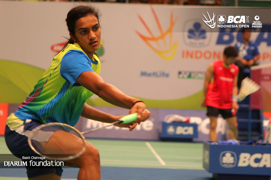 Shindu P (India) mengembalikan shuttlecock kearah HsuYa Ching (Taipe).