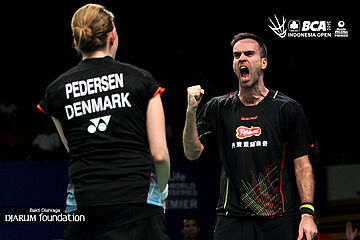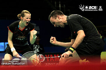 Selebrasi Joachim Fischer/Christinna Pedersen (Denmark) setelah berhasil mengalahkan Preaven Jordan/Debby Susanto (Indonesia).