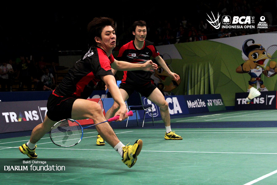 Lee Yong Dae/Yoo Yeon Seong (Korea) berusaha menggapai pengembalian dari Marcus Ellis/Chris Langridge (Inggris).