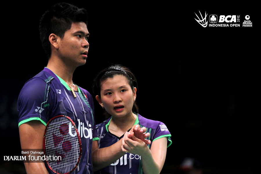 Joachim Fischer/Christinna Pedersen (Denmark) berbisik sebelum melakukan serve.