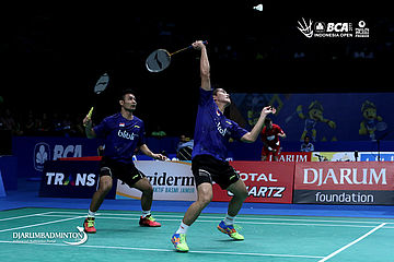 Berry Angriawan/Hardianto (Indonesia) bersiap menyambar pengembalian