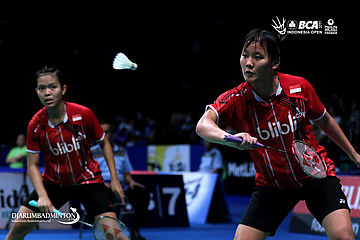 Agatha Imanuela/Siti Fadia (Indonesia) bersiap menghadang serangan