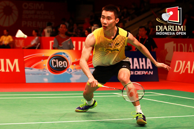 Lee Chong Wei (Malaysia) bersiap mengembalikan shuttlecock ke arah Wang Zhengming (China).