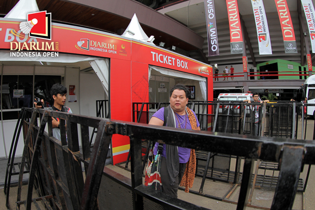 Salah satu artis ibu kota, Pampam setelah membeli tiket untuk menyaksikan langsung Djarum Indonesia Open Super Series Premier 2013 di Istora Senayan, Jakarta.