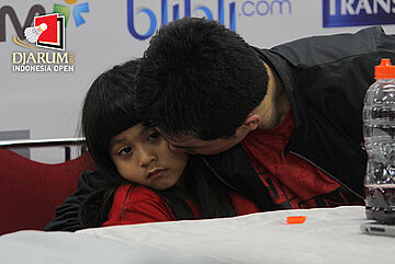 Taufik Hidayat (tengah) saat press conference yang didampingi putrinya.