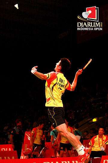 Chen Long (China) mengembalikan shuttlecock ke arah Tommy Sugiarto (Indonesia).
