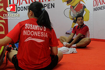 Muhammad Rijal/Debby Susanto (Indonesia) saat melakukan pendinginan usai bertanding.