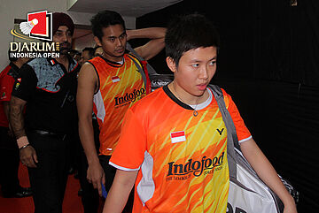 Tantowi Ahmad/Liliyana Natsir (Indonesia) sebelum memasuki lapangan pertandingan.