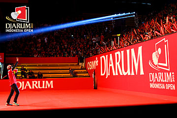 Steny Agustaf (kiri) saat menyapa para suporter Indonesia yang memadati tribun di Istora Senayan.