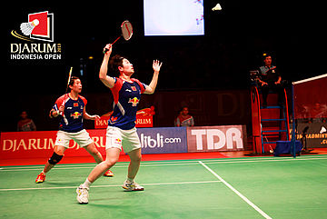 Bao Xiyin/Cheng Shu (China) bersiap mengembalikan shuttlecock ke arah pasangan Tian Qing/Zhao Yunlei (China).