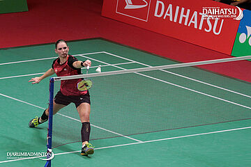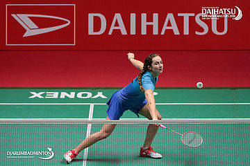 Gregoria Mariska Tunjung (Indonesia) Mengembalikan Shuttlecock
