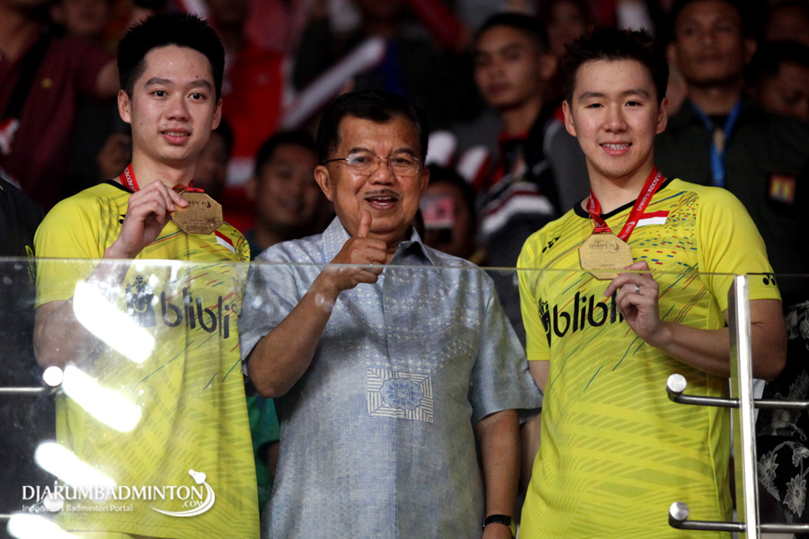 Kevin Sanjaya Sukamuljo/Marcus Fernaldi Gideon (Indonesia) Berfoto Bersama Wakil Presiden Indonesia, Jusuf Kalla Usai Pengalungan Medali