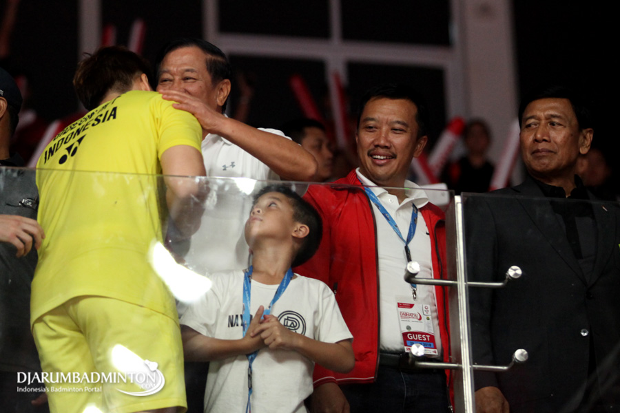 Marcus Fernaldi Gideon (Indonesia) Mendapatkan Pelukan Dari Agum Gumelar Usai Pengalungan Medali