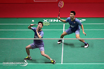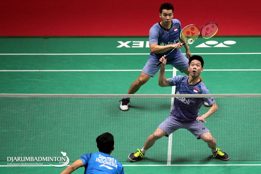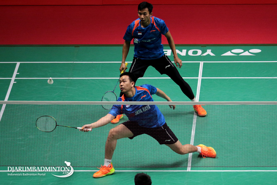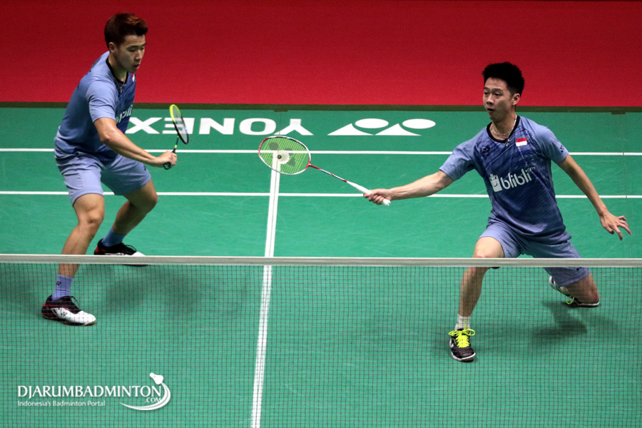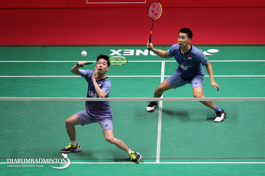 Hendra Setiawan/Rian Agung Saputro (Indonesia) Mengembalikan Shuttlecock