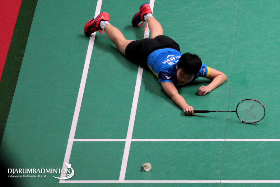 Goh Jin Wei (Malaysia) Terjatuh Saat Berusaha Menggapai Shuttlecock