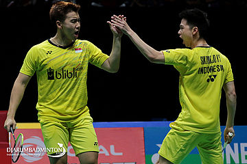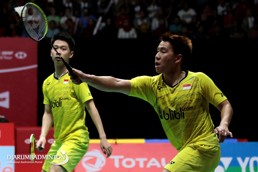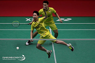 Kevin Sanjaya Sukamuljo/Marcus Fernaldi Gideon (Indonesia) Mengembalikan Shuttlecock