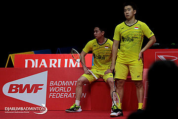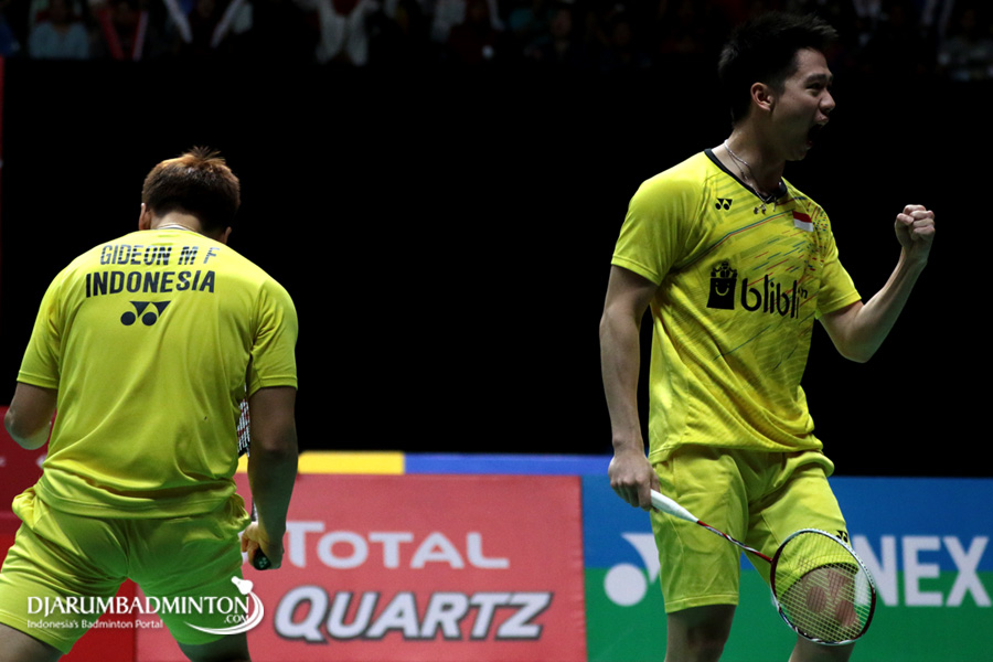 Ekspresi Kevin Sanjaya Sukamuljo/Marcus Fernaldi Gideon (Indonesia)