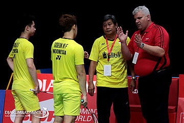 Aksi Protes Sanjaya Sukamuljo/Marcus Fernaldi Gideon (Indonesia)