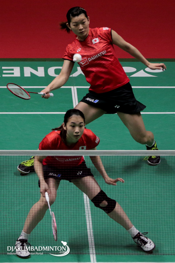 Ayaka Takahashi/Misaki Matsutomo (Jepang) Menghadang Serangan