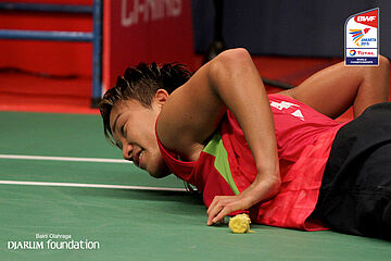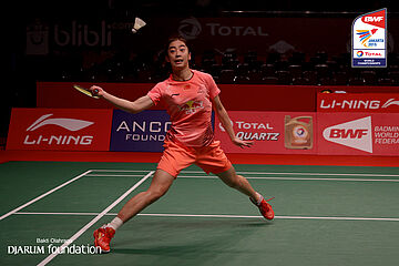 Wang Shixian (CHN) berusaha menggapai shuttlecock