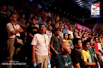 Ribuan supporter menyanyikan lagu kebangsaan Indonesia Raya