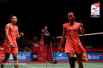 Zang Nan/Zhao Yunlei (CHN) berusaha menggapai shuttlecock