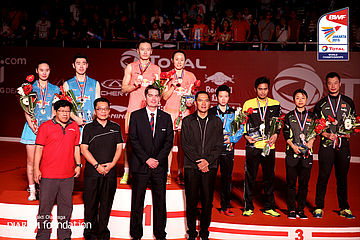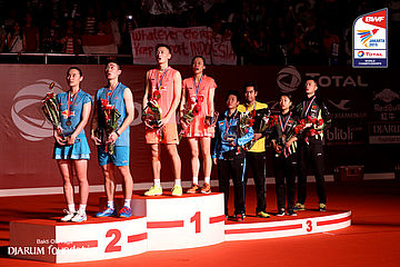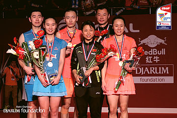 Tiga pasang pebulutangkis China di atas podium
