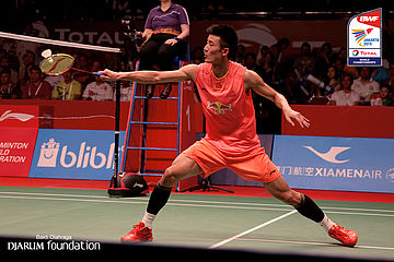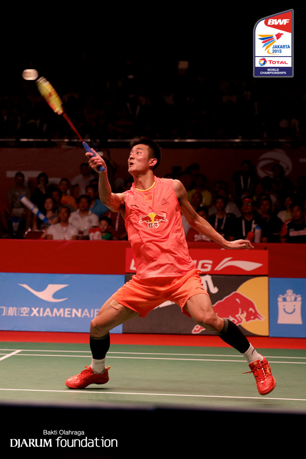 Chen Long (CHN) mengembalikan shuttlecock