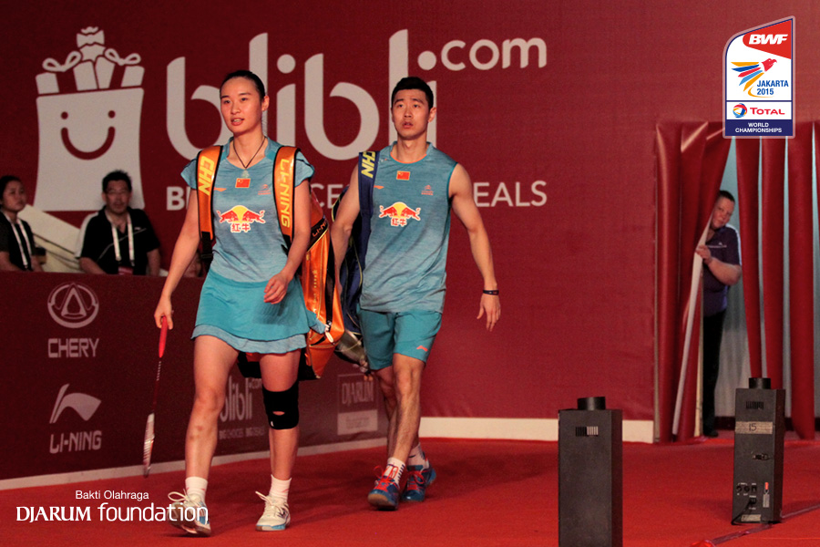 Liu Cheng/Bao Yixin (CHN) berjalan memasuki lapangan