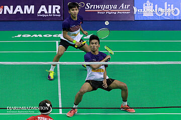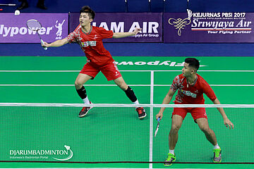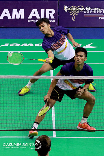 Ardy Nugroho/Forverio Rivaldo (Kalimantan Selatan) Berusaha Mengembalikan Shuttlecock