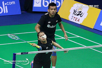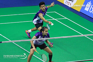 Pramudya Kusumawardana/Indah Cahya Sari Jamil (Jawa Tengah) Mengembalikan Shuttlecock