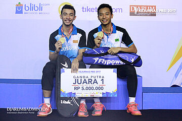 Hendra Setiawan/Mohammad Ahsan (DKI Jakarta/Jawa Tengah) Berfoto Di Podium Juara